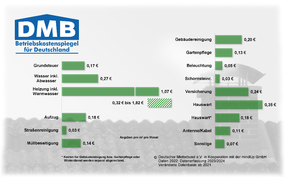 (dmb) Mieterinnen und Mieter mussten im Jahr 2022 in Deutschland im Durchschnitt 2,28 Euro/qm/Monat für Betriebskosten zahlen. Rechnet man alle denkbaren Betriebskostenarten mit den jeweiligen Einzelbeträgen zusammen, kann die sogenannte zweite Miete bis zu 2,87 Euro/qm/Monat betragen.